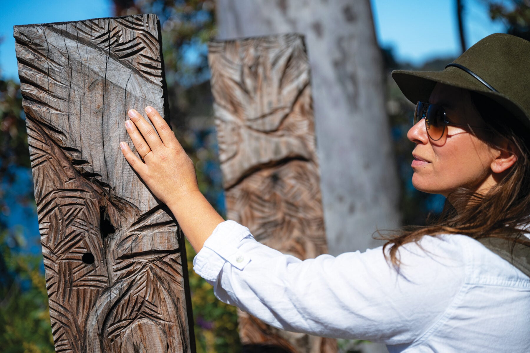 Art and language weave throughout the walk: Leanne Brook’s Mirida-wara (Two Sea Eagles) artwork at the trailhead, Bronwen Smith and Gavin Chatfield’s community mural at Caseys Beach, Nigel Stewart’s Gadu – Umbarra – Gadu Dreaming mural at Malua Bay Park, and timber message poles that carry dhurga words, themes and motifs for the trail. Goanna (burnaaga) is one feature at Wimbie. Contemporary expression sits in dialogue with ancient practice – a reminder that Munjip, in dhurga, means “walking together, let’s go.”
