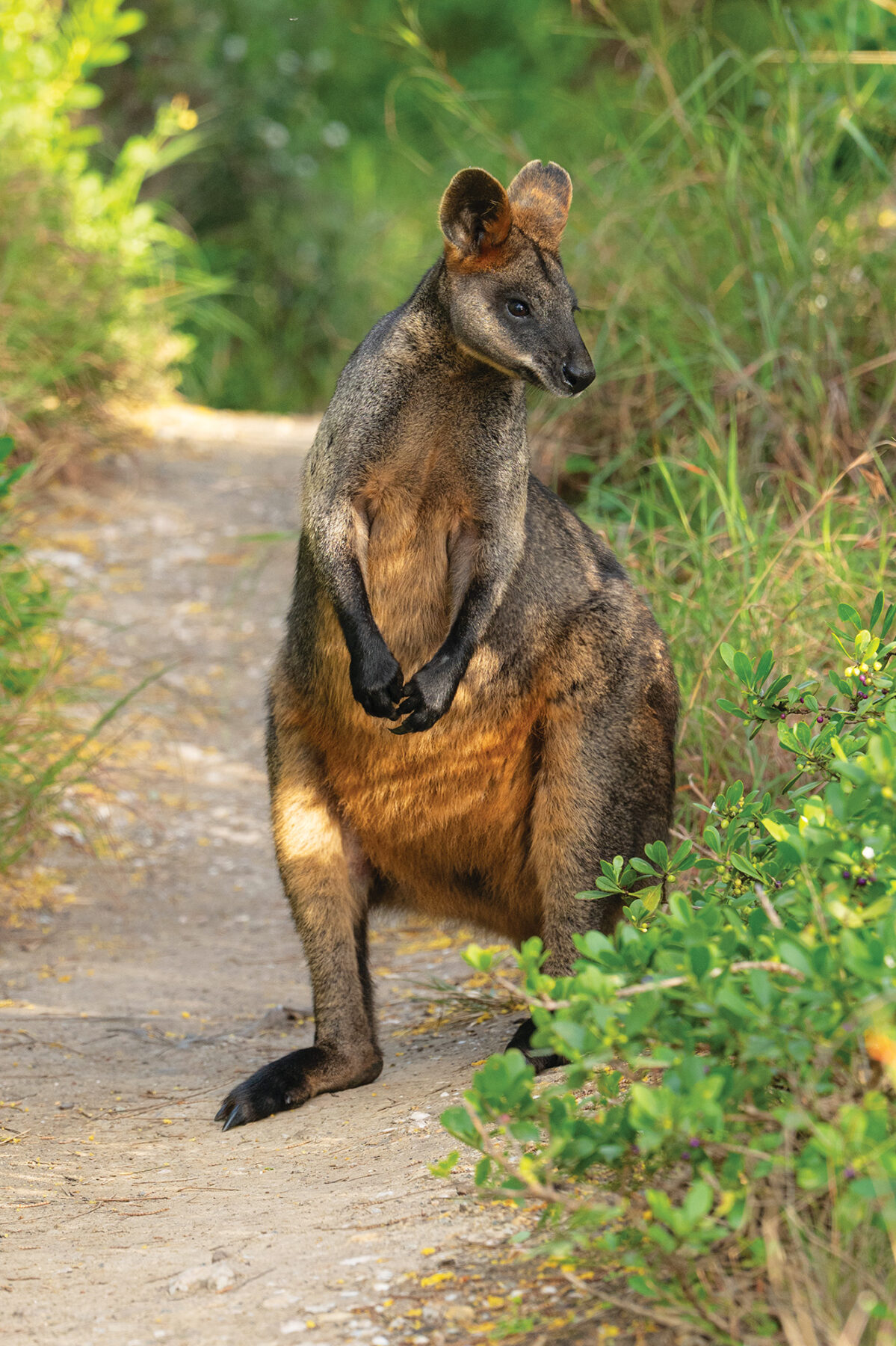 Returning from Pretty Point, we find ourselves in the company of kin. A swamp wallaby bounds nearby, curious and unafraid. A blue-tongue lizard shuffles from the rocks, slow and deliberate. A tiny jacky dragon freezes in the sunlight like a miniature sentinel. An echidna (dganagubadj) curls tight at the track’s edge. And from the cliffs, whales (muriyira) lift their tails as if to mark our passing.