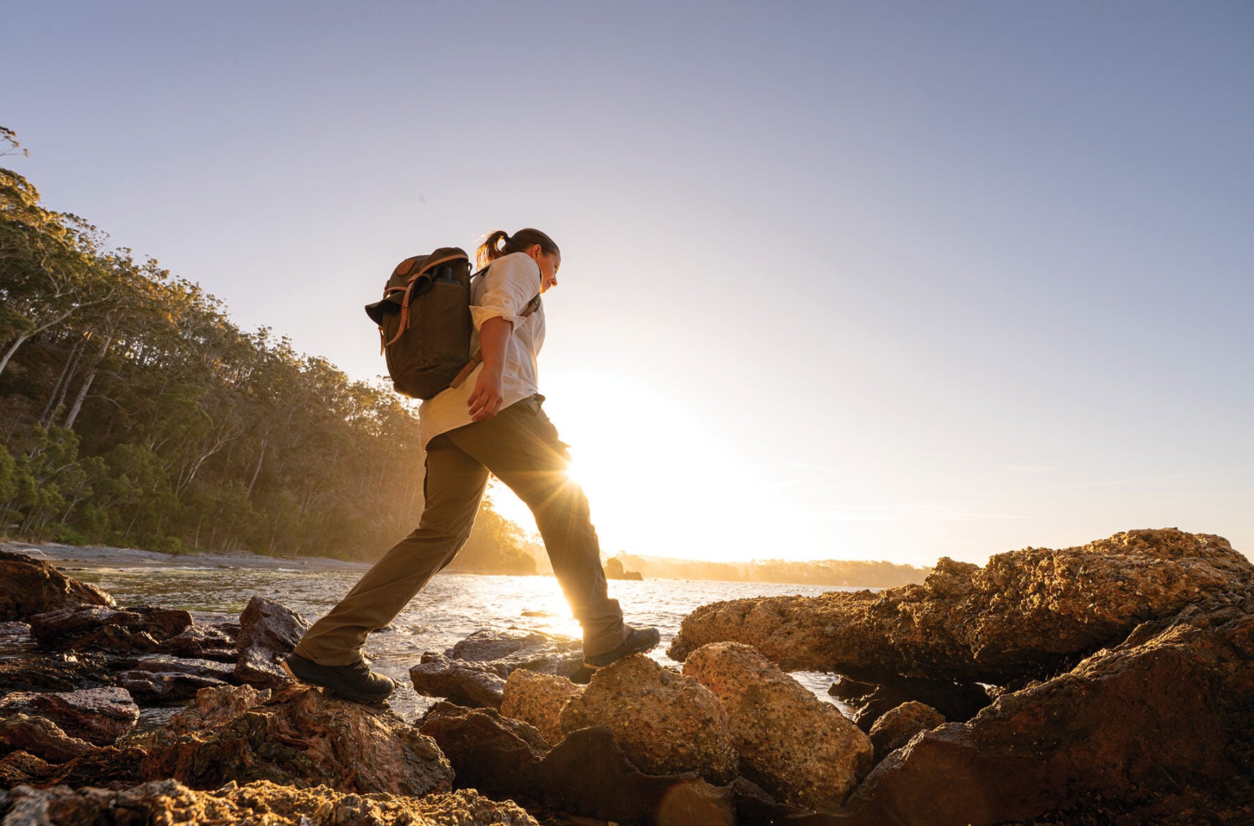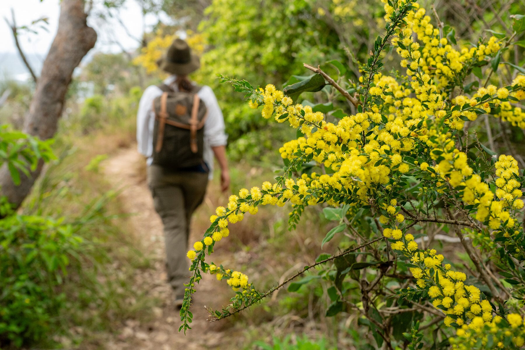 I barely let my partner, Loz, catch her breath before blurting, “We’re going hiking.” I’d just been offered the job, but she was jet lagged, having just flown in from South America. An unimpressed eyebrow lifted – until I mentioned this walk was less “ultralight tent” and more “culture by the ocean,” with retreat-style digs at The Bower at Broulee and a gin tasting at Mogo’s Foxdog Distillery. Ten minutes later, a bag sat by the door: hiking boots and pants wedged beside a bikini, an evening dress, a beach towel, and a down jacket. “I’m ready,” she said. Neither of us knew exactly what we were in for.