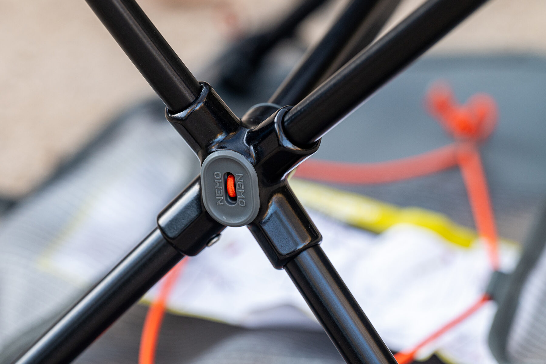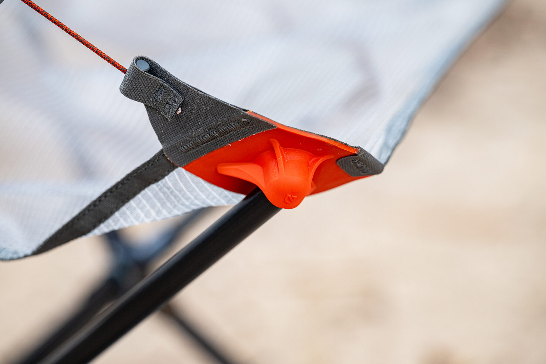 Nemo has used Bluesign®-approved, fully recycled, stretch-mesh fabric for the seat. This fabric prevents pooling water after unexpected rain showers and dries quickly, making it a reliable all-weather option. They’ve ditched heavier webbing in favour of HTP and Dyneema cordage, an ultra-strong yet featherlight material commonly used in high-performance climbing gear. This cord system integrates with cam-style clamps, allowing the chair’s reclining function to be adjusted to different seating angles. Whether you want an upright posture for eating or a more laid-back recline for stargazing, the system is quick to tweak.