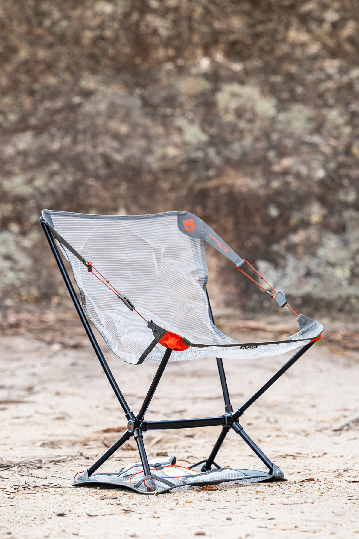 Comfort-wise, it’s good but not perfect. Compared to the original Moonlite, the backrest is slightly shorter and narrower, which might leave taller folks (like me) feeling a bit unsupported. I’m being picky; while it may not be as supportive as its predecessor, I found no issues during testing. At 25.4cm off the ground, the seat is relatively low, keeping it stable but making getting seated and unseated a bit of a chore – especially after a long day on the trail when your knees are plotting revenge. But that’s true for many ultra-light compacts, including the Helinox Zero at 21.6cm.