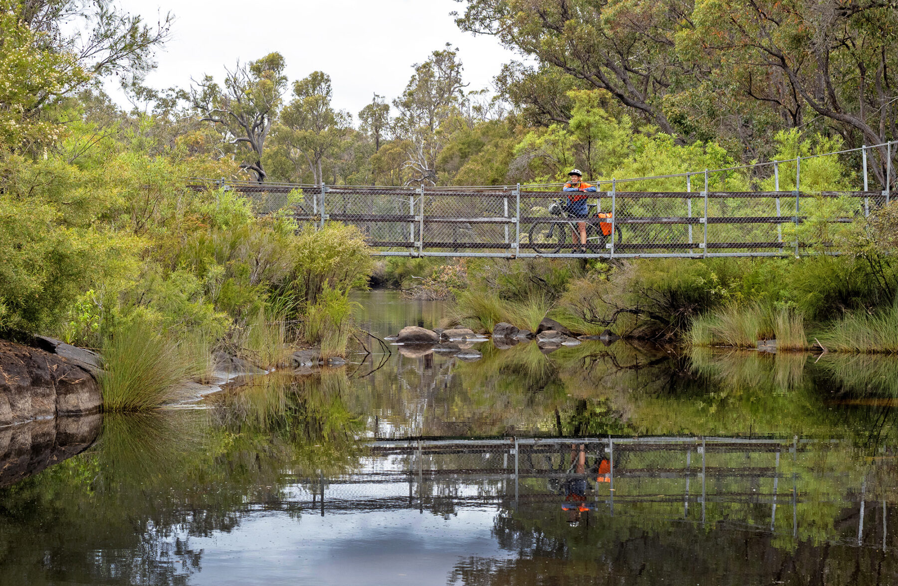 The Munda Biddi’s pleasures are not all on the bike, though there are plenty of them. Swims beckon as the trail crosses streams and rounds lakes and pools (and even a swimming dam). There’s a canopy to wander through on the Valley of the Giants Tree Top Walk, brewpubs (for carb-loading, of course), wineries, beaches in Walpole and the poster-worthy Greens Pool, plentiful wildlife to view, and a couple of rail-trail sections on which the Munda Biddi pauses for breath between the hills.