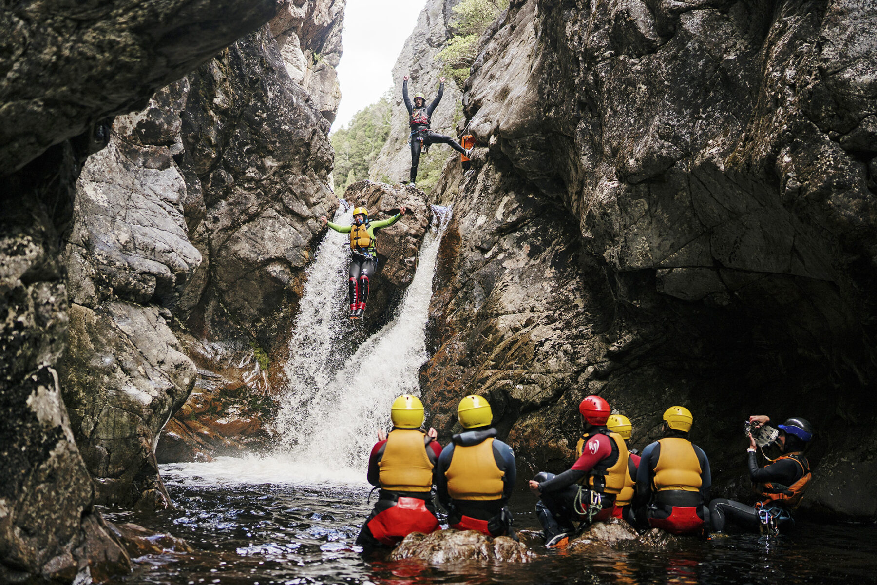The canyon is entered via a 12m abseil, dunking you into the water like a cold teabag, and from there it’s a canyoning puzzle to make your way to the other end of the canyon, 750m downstream. Doing so employs the full set of canyoning skills – wades, swims, abseils, high leaps into deep pools, traverses and slides through chutes. It’s a game of Twister in nature.