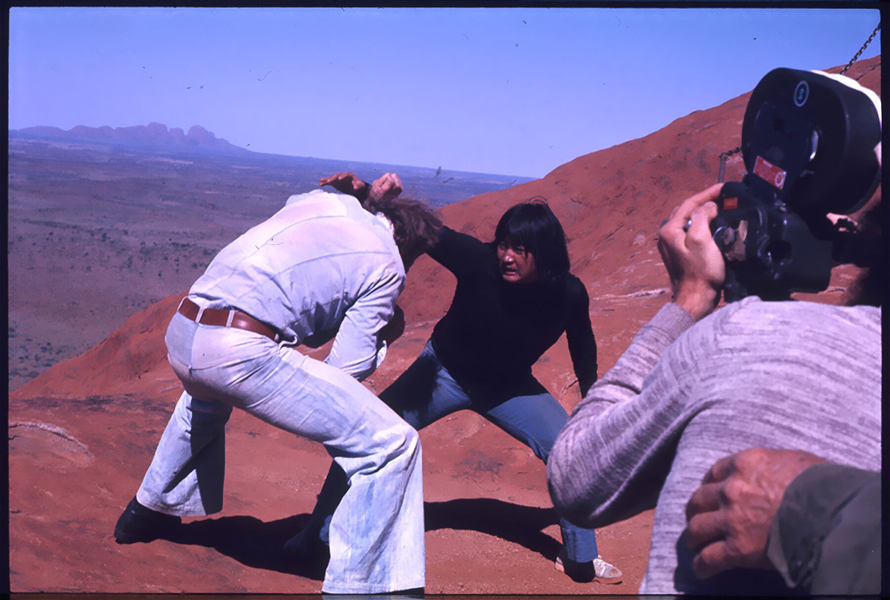 The film’s opening action scene on the rock featured an intricate kung-fu brawl, without protective padding, between actors Sammo Hung and Roger Ward on a slightly perpendicular slope – a spot where many unfortunate tourists had fallen to their deaths. Adding to this outrageous scenario was one amusing incident involving some Japanese tourists who caught one of the performers baring it all at the national landmark. Considering the current protection of Uluru, it’s hard today to fathom any of this happening.