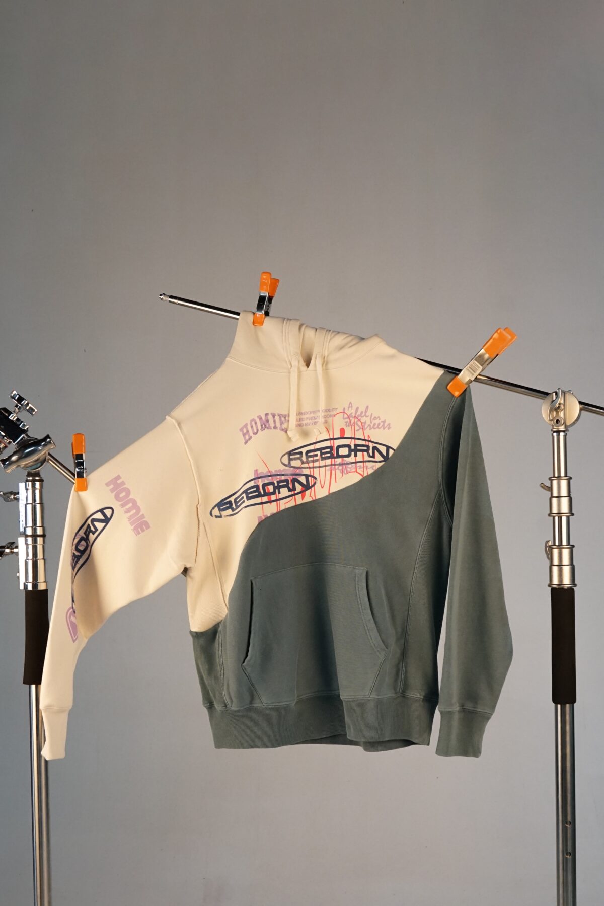 HoMie has now partnered with ABMT Textiles to create Australia’s first upcycling factory, which will scale up operation from about 50 garments a week to 1500. “Essentially we use a zero-waste process, where we generally take three garments and then cut it up in the same pattern and then jigsaw them back together…and chuck a screen print over the top, or embroidery, or whatever the [collaborating] brand might like to do. So all garments are different colours and different in their own way,” Marcus says.