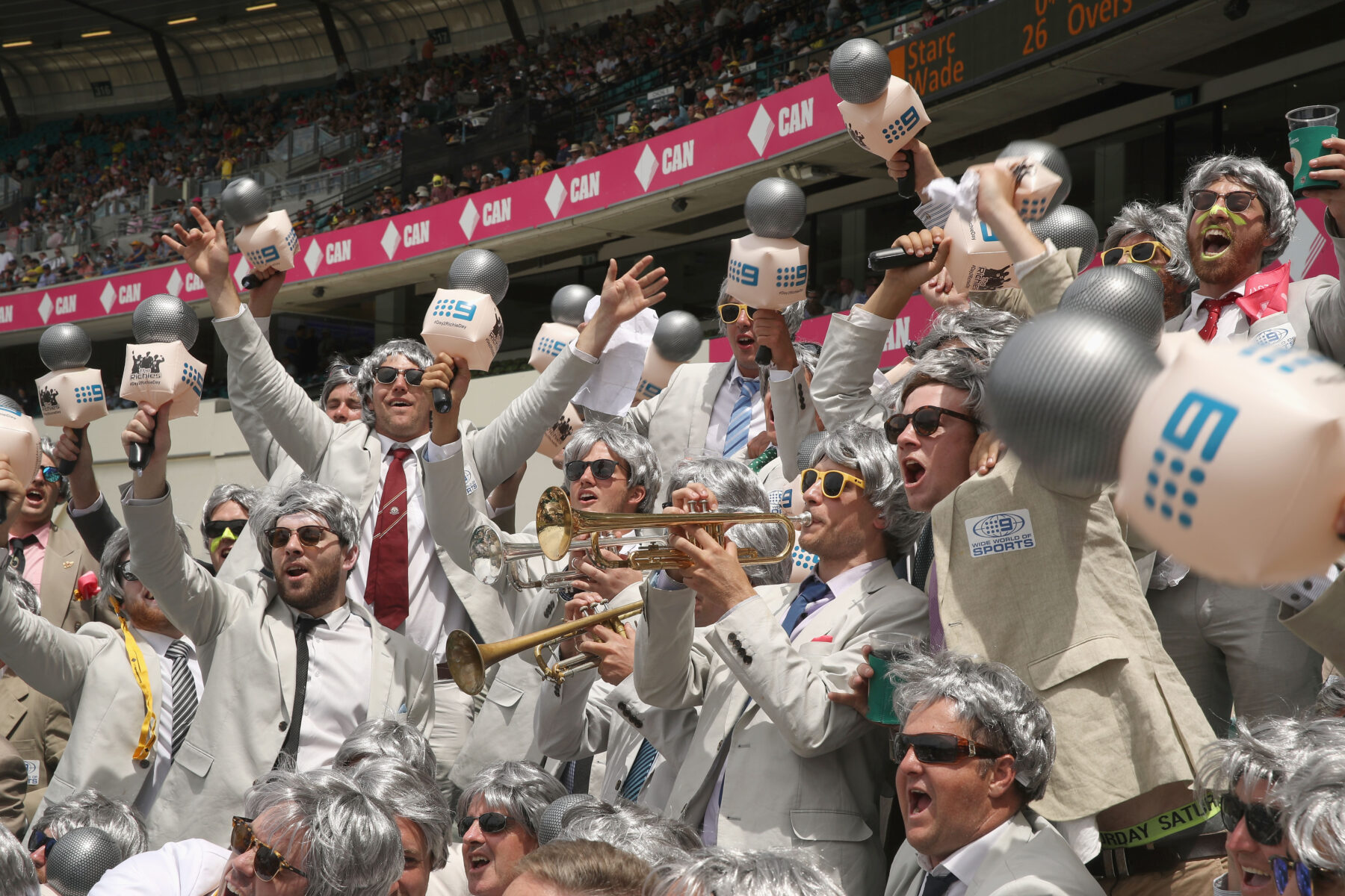 Australian supporters responded in due course with the ‘Fanatics’, who were initially formed to follow Australia in tennis’s Davis Cup in 1997 and subsequently appeared at Australian cricket fixtures in the early 2000s. They were then joined in 2011 by ‘The Richies’, who dress uniformly in cream jackets, shirts and ties, with silver wigs and compulsory microphones, in honour of the much-loved and now sadly departed Richie Benaud, who after captaining his country in the 1950s went on to become the voice of cricket for generations as a commentator.