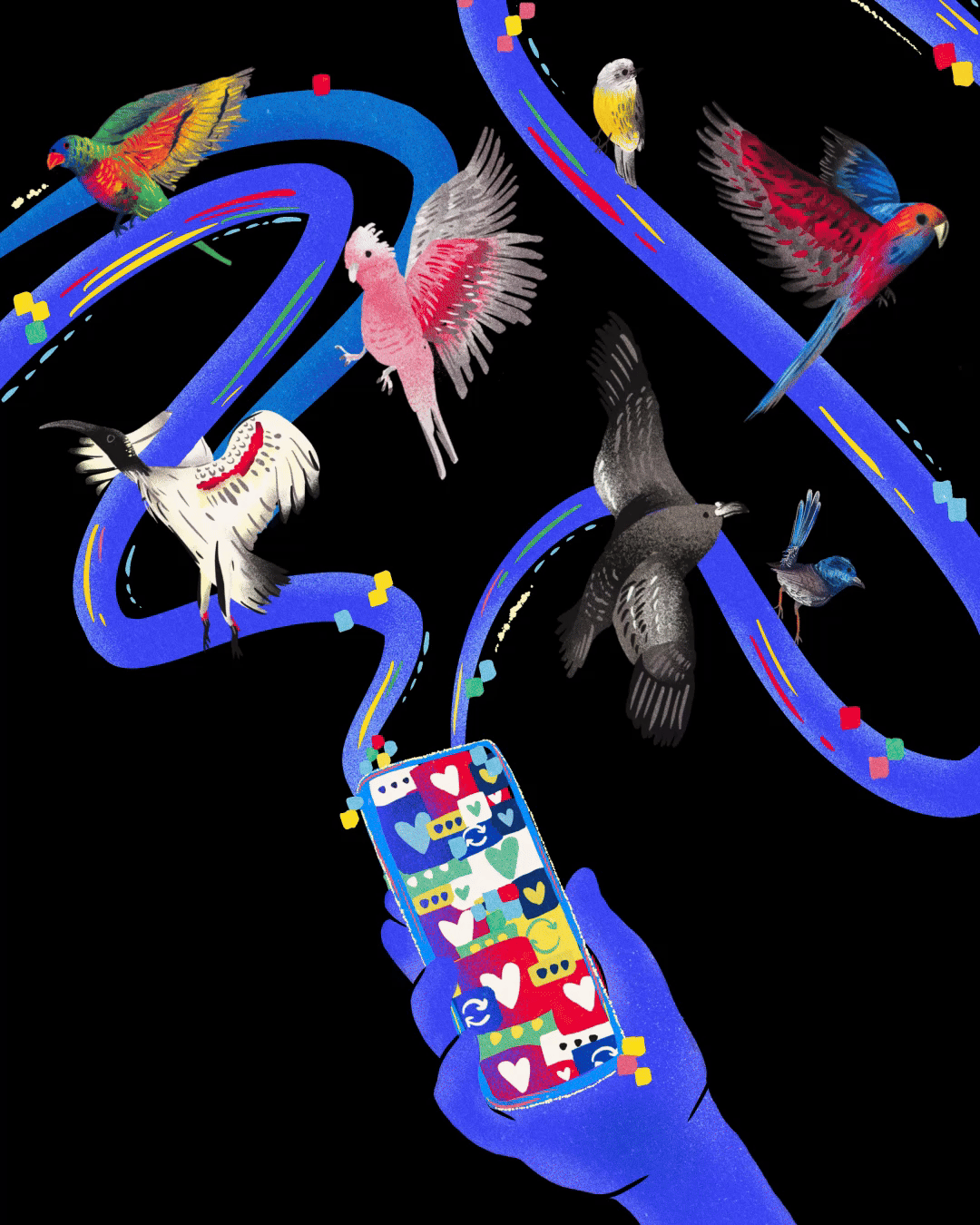 “White-browed scrubwren. Yep. Howsabout that!” Ned looks back at his phone, beaming. “Never thought I got them out at my place. It’s pretty dry and rocky. But the Callistemon hedges I planted a few years back seemed to have done the trick. Gives the little birds somewhere to hide. Yeah, I got soldier birds. Noisy farken miners! They’re everywhere. Not much we can do about that, except give some shelter for the little ones they always chase. And I’ve been dealing with the cats. You should come out and see for yourself. Bring the old man. We might get him interested yet!”