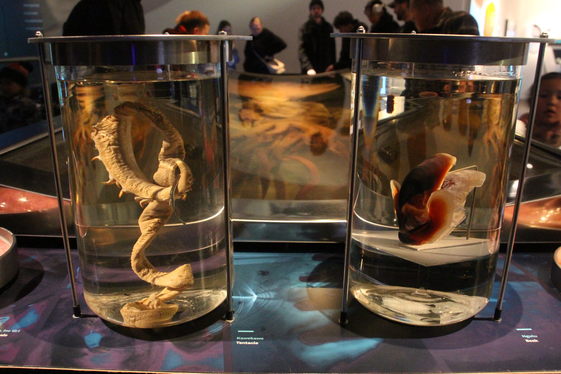 Taking centre stage within Te Papa’s Te Taiao | Nature exhibition, the squid sits preserved within a large tank, dominating the space. Nearby jars contain tentacles and even a beak of the species.