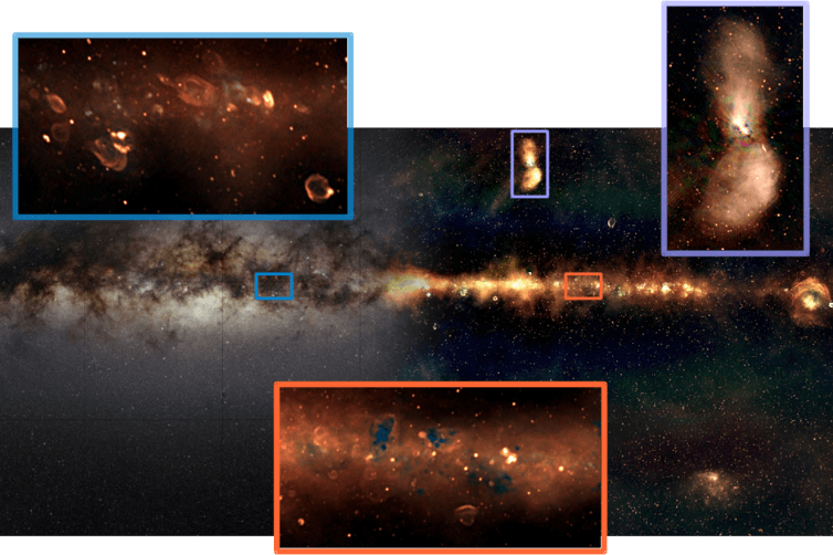 In the image above, the inset highlights show the shell-like remains of ancient supernovae (blue box), ionised regions around bright stars (orange box), and radio jets coming from the nearby galaxy Centaurus (purple box). All of these features are undetectable in visible light.