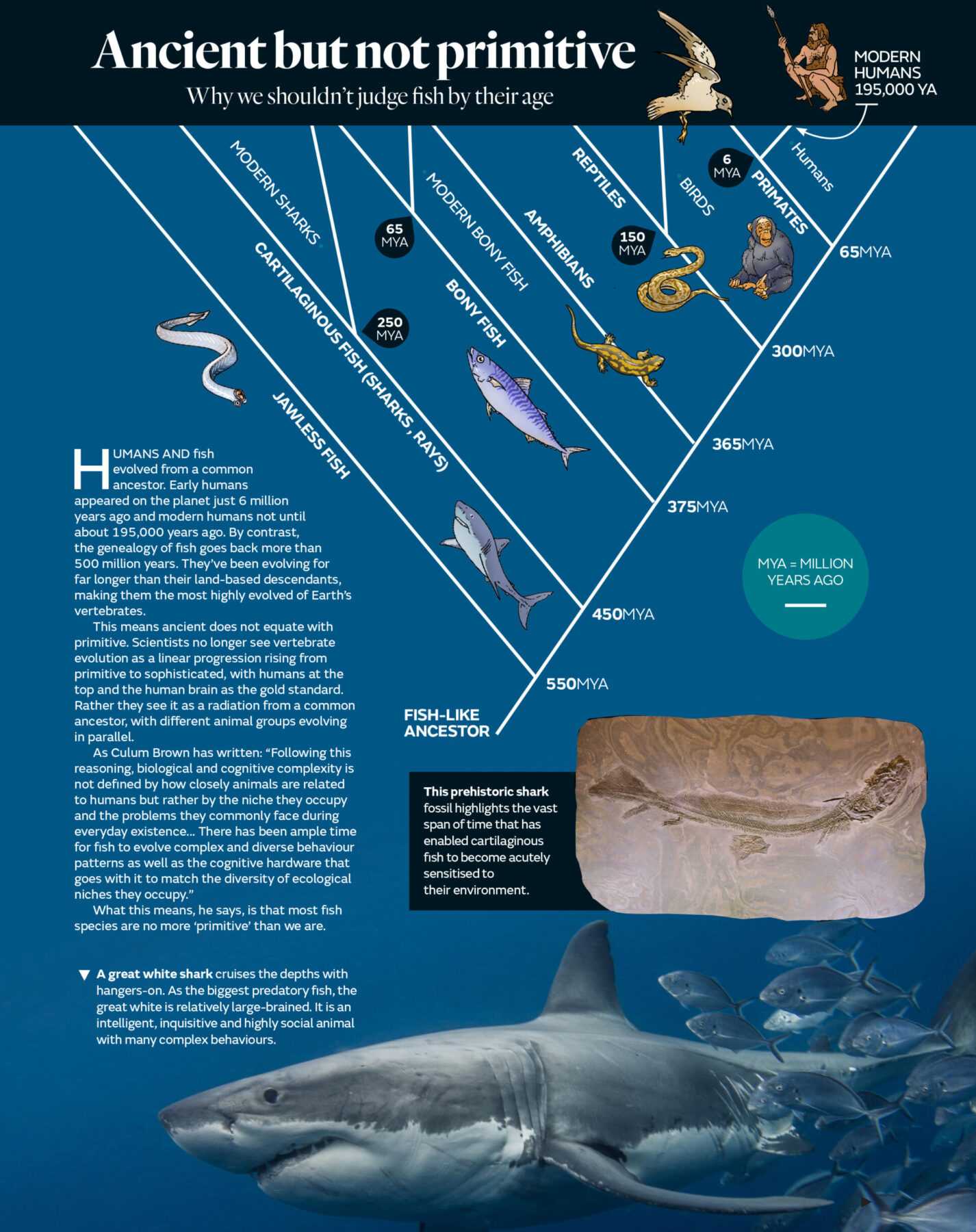 But despite their pedigree and evolutionary success, fish have an image problem. Humans tend to equate ancient with primitive, clinging to an obsolete view of evolution as a steady progression from inferior to advanced, with highly intelligent humans at the pinnacle. But that’s turning out to be a highly simplistic reading of the facts.