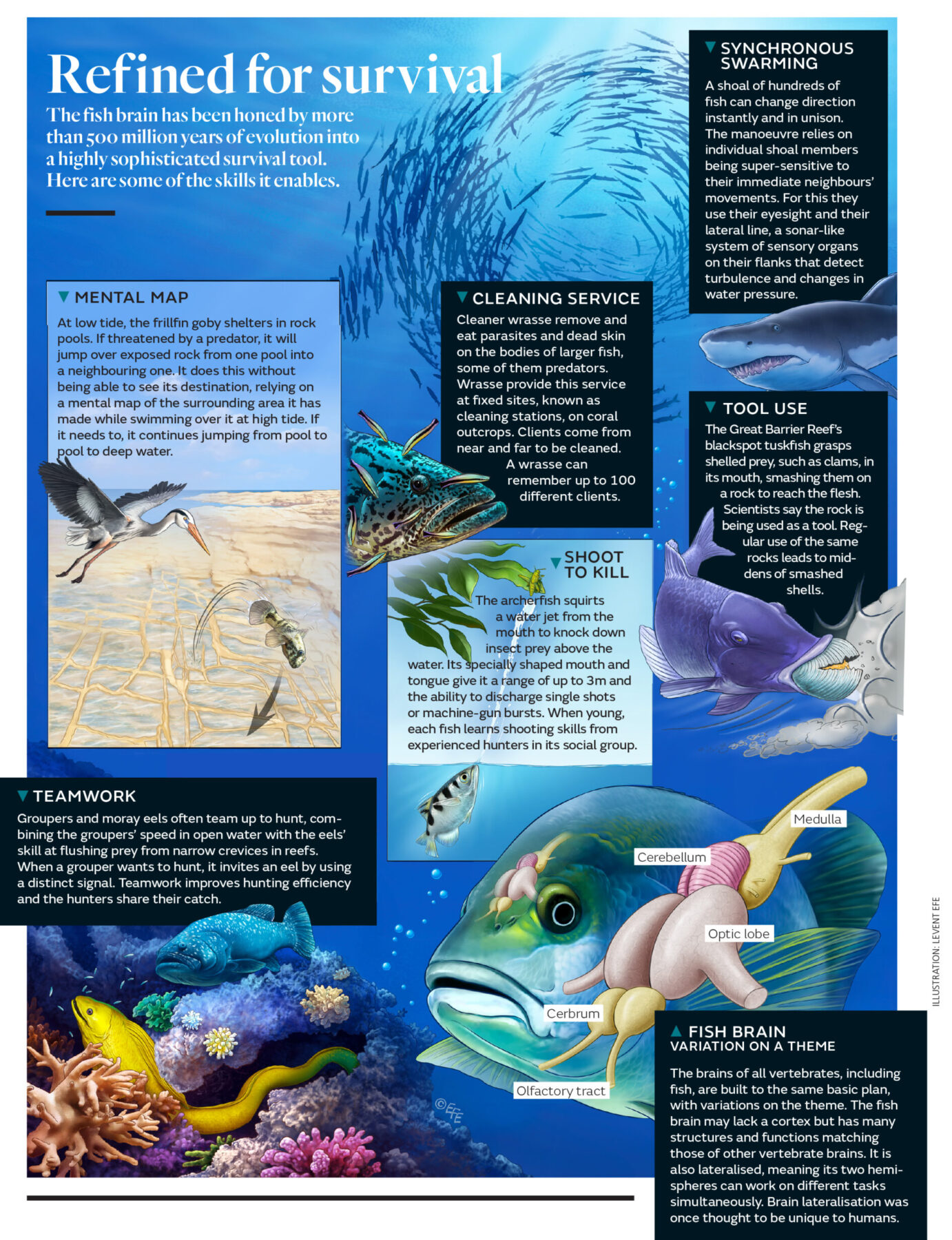 We also seem to be unduly influenced by a perception that small brains must be primitive. On a scientific level, it’s a misconception that because the fish brain lacks a cortex – which in humans is responsible for perceiving, producing and understanding language – it must necessarily be incapable of performing many of the tasks of a human cortex. But Culum argues that the human cortex has taken on a huge number of roles that were once the domain of other brain regions. After all, a small brain and lack of a cortex hasn’t prevented many birds from becoming super-smart. Why should fish be any different?