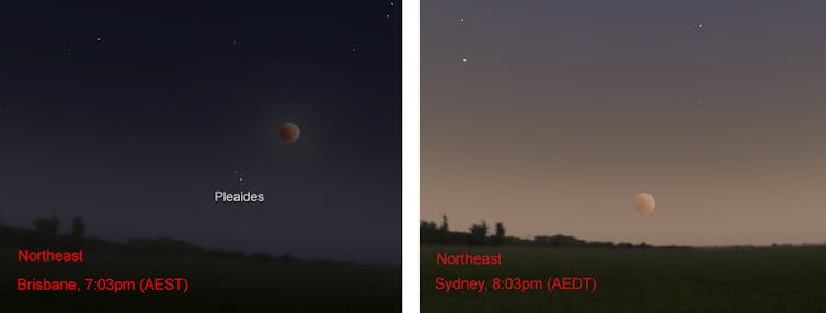New Zealand is in a better position to see the eclipse than Australia. Viewers on the North Island will see the entire event, while for the South Island the Moon rises about half an hour after the eclipse begins. The eclipse maximum will occur at 10:03pm NZDT, so it may even be possible to see a slight red tinge to the Moon against the dark sky.